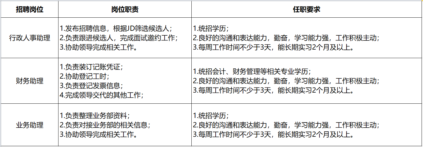 行政人事助理 | 1.发布招聘信息,根据JD筛选候选人; 2.负责跟进候选人,完成面试邀约工作; 3.协助领导完成相关工作。 | 1.统招学历; 2.良好的沟通和表达能力,勤奋,学习能力强,工作积极主动; 3.每周工作时间不少于3天,能长期实习2个月及以上。 |